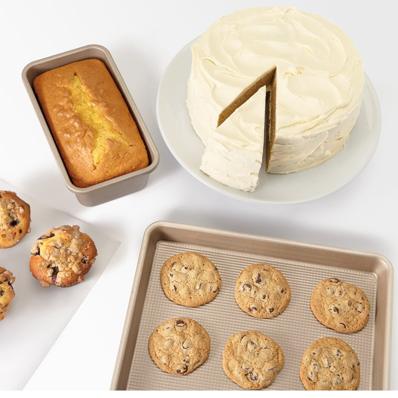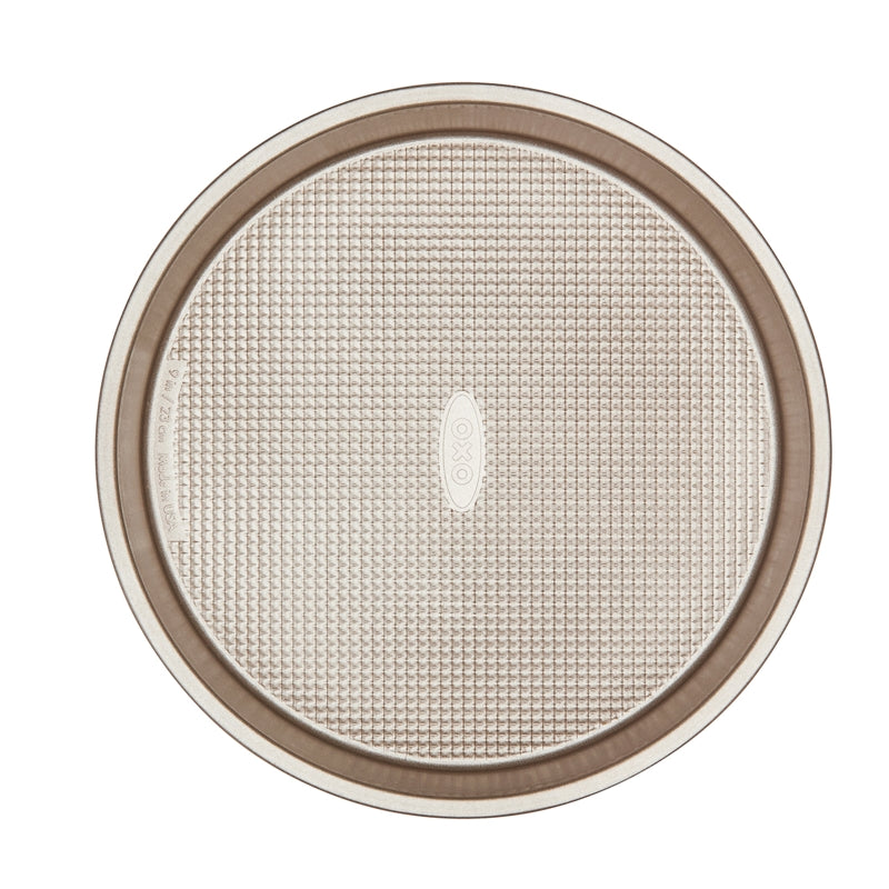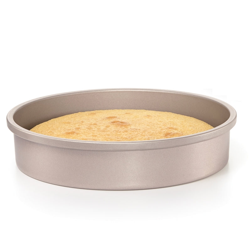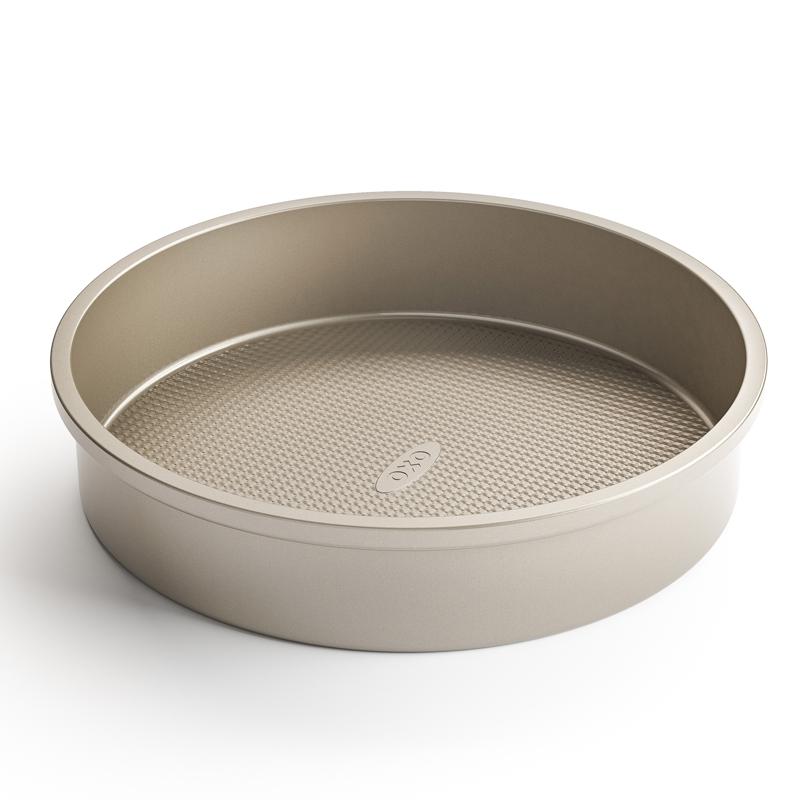 Round Cake Pan, 9" / 23cm, non-stick, BPA free. Perfect for layer cakes and more. OXO's line of commercial-grade Bakeware provides professional quality, exceptional durability and superior performance. Each pan is constructed with ILAG™ technology, a Swiss-engineered, PTFE, ceramic-reinforced, two-layer, commercial-grade coating that provides the ultimate non-stick food release. This feature makes it resistant to scratches, stains, corrosion and abrasions. The micro-textured pattern ensures even baking by minimizing surface contact and promotin g airflow, and adds structural rigidity to help prevent warping. Visible pan dimension markings on top surface allow for quick and easy size identification